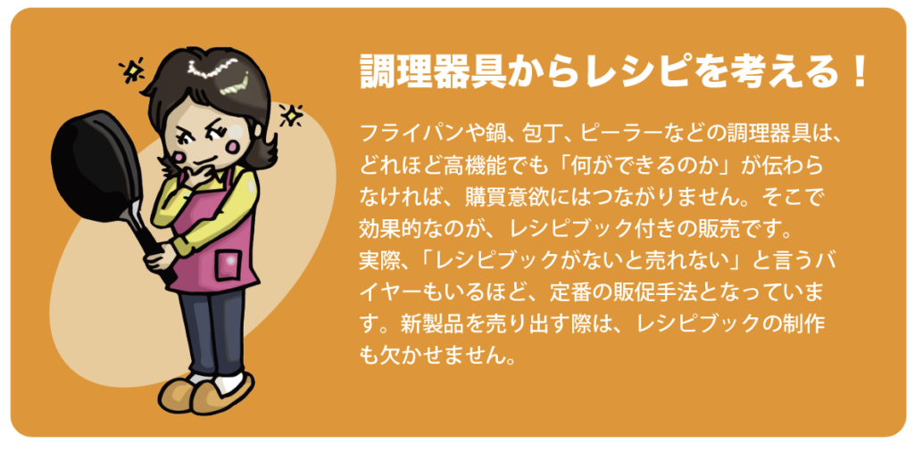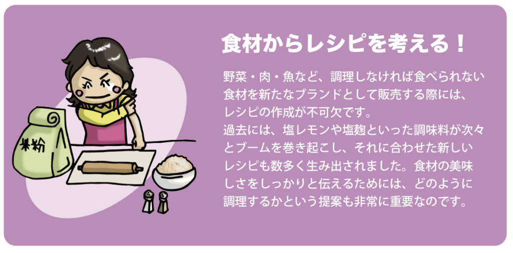 また、完成したレシピをレシピブックとして商品に同梱したり、店頭に設置したりすることで、使用シーンを直感的に伝えることができ、購買意欲の向上やリピート促進といった販促効果も期待できます。レシピは単なる説明資料ではなく、商品と生活を結びつける有効なコミュニケーションツールです。